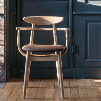 Dineer comfortabel op de Teo eetkamerstoel met armleuningen en een gevoerd zitje. Beschikbaar in massief eik (Natural oak) of beuk (Nearly black).