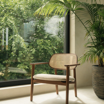De Titus fauteuil heeft een diep comfortabel zitje en een rug van gevlochten rotan. Licht en lucht stromen door het cannageoppervlak en creëren zo een fijne schaduw in de kamer. Verkrijgbaar met een zwart eiken frame of natuurlijk eiken frame.