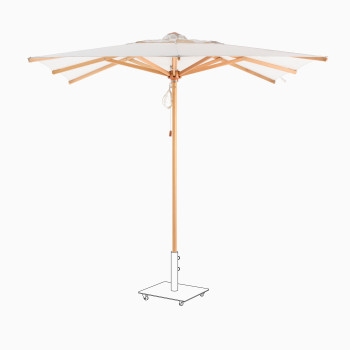 Stoffen overkapping | mast in gelakt eucalyptushout | optioneel: gepoederlakt stalen onderstel met zinklaag en wielen met rem.